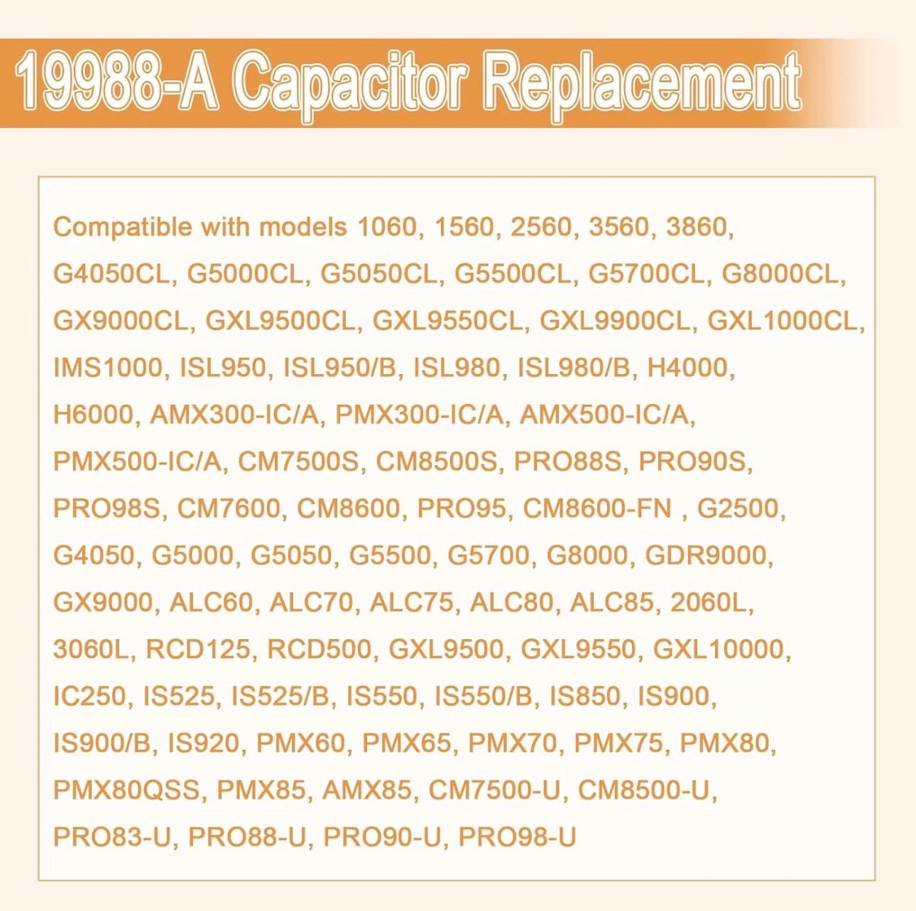 【USE WITH】19988A garage door opener capacitor is Compatible with All Genie 1/2 Horse Power Garage Door Openers(replacing 19988 and X-19988-A), EXCEPT models GPS-1200 Stealth, PMX-12; NOT FOR running Capacitor