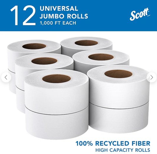 Scott Essential Recycled Jumbo Toilet Paper, 2-ply, White, 12 Rolls/Case